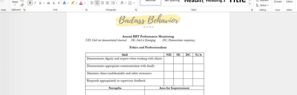 Competency checklist template for RBT annual performance reviews. Covers the essential items regarding ethics, professionalism, and clinical skills with a notes section.