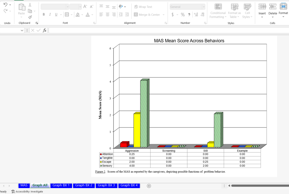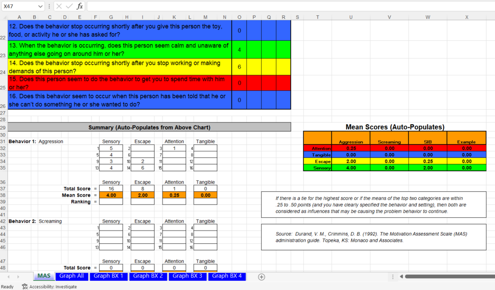 This is an all-inclusive Excel workbook with instructions designed to simplify the administration of the MAS, or Motivation Assessment Scale. It contains sections for behavioral details as well as function based questions that auto-populate a table for the assessor. It contains information on instruction and interpretation of Mean Scores. The table created by input generates a cumulative graph demonstrating functions across behaviors in sheet two, as well as a graph that's auto-generated for each individual behavior in the subsequent sheets in the excel workbook.